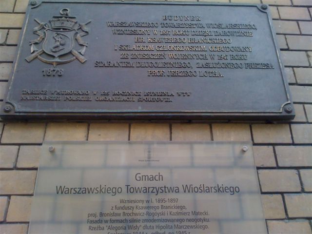 Ten pokaźny dom z żółtej klinkierowej cegły, zbudowany w stylu neogotyckim, przetrwał wojenne zawieruchy, jedynie w 1944 r. wnętrze strawił pożar. Odnowiony po wojnie, obecnie objęty jest ochroną konserwatora zabytków. Zbudowano go w latach 1895-1897 na działce podarowanej WTW przez hrabiego Ksawerego Branickiego, według projektu Bronisława Brochwicz-Rogoyskiego. Niezwykle bogata fasada ozdobiona jest alegoryczną rzeźbą Hipolita Malczewskiego, przedstawiającą Wisłę. Na koszty budowy złożyli się członkowie Towarzystwa (!).